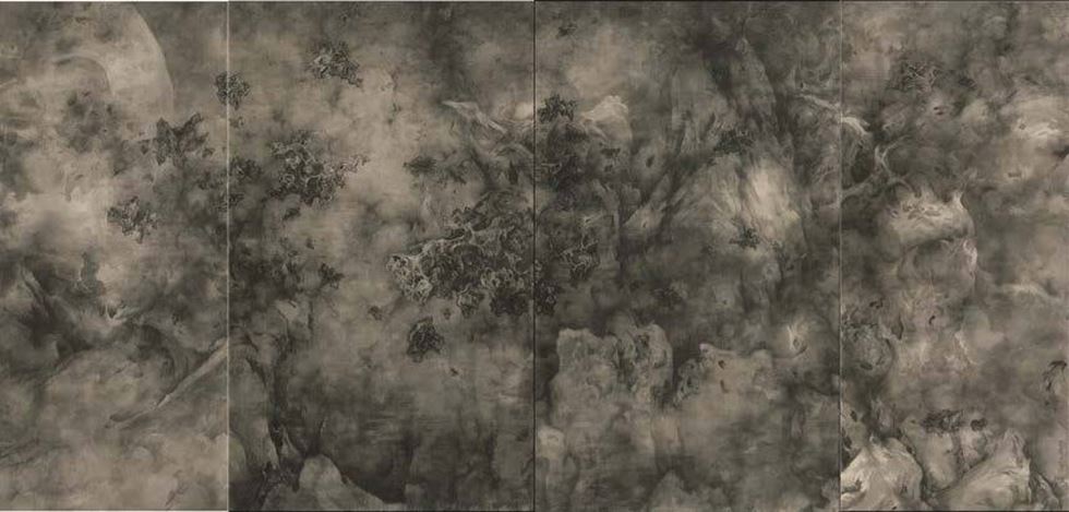One of the works is a large painting that consists of four panels (each 100 X 200 cm) painted in Chinese ink on silk, titled “Yang guan chui xiang” or “Looking up at the Configuration from Heaven”, which was completed in 2014 and is now in the Xiling collection. Its subject is cosmological flux—a depiction of celestial chaos, with asteroid-like rocks floating in vaporous mist against a dissolving background. Despite the fact ink is the only pigment applied onto white silk, the painting gives an impression of multi-layers of shades, light and color.